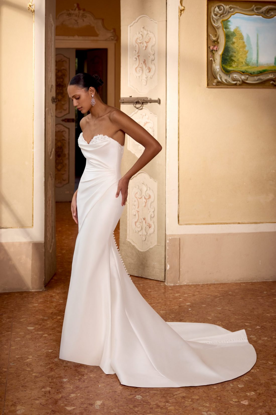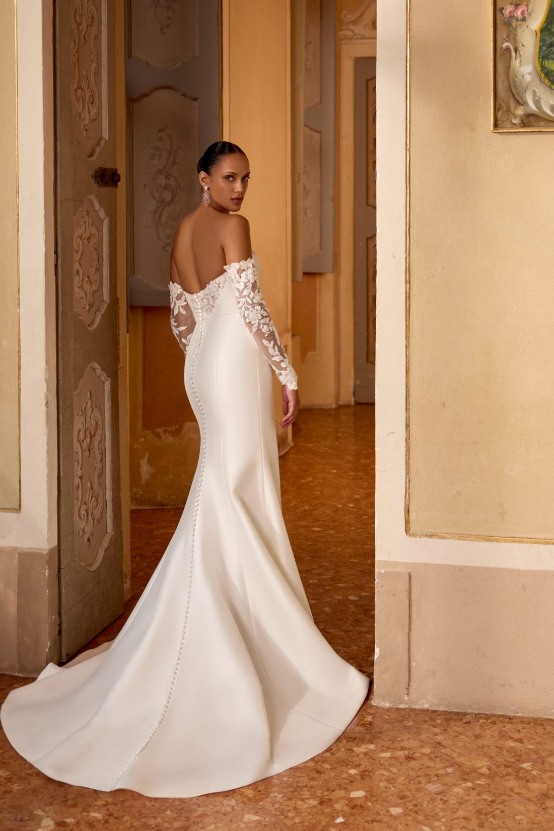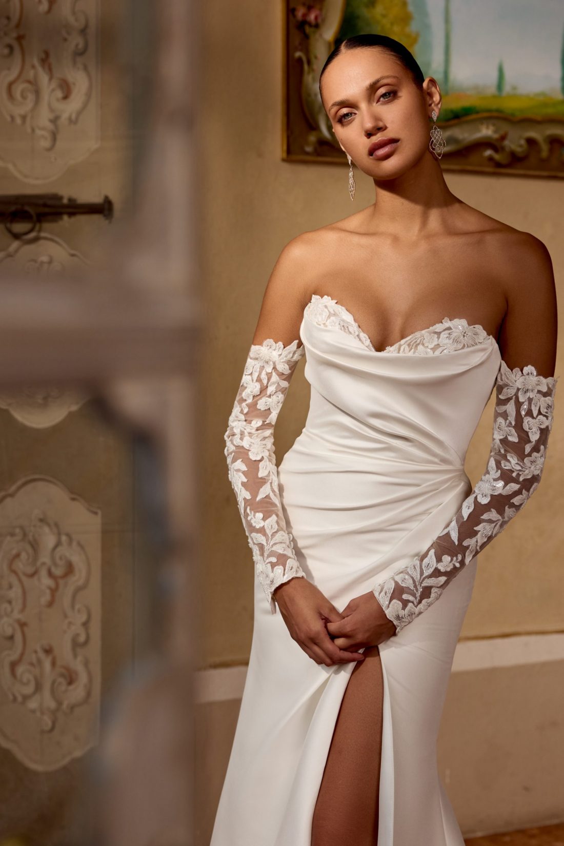 Kendall is a stretch mikado fit and flare gown with a peek-a-boo sweetheart neckline, adorned with beaded and sequined lace appliques. Featuring a draped stretch Mikado, sweetheart neckline that leads to ruching in the bodice and an optional side slit in the skirt. The illusion back is adorned with sparkling lace appliques, finished with buttons from back neckline down the chapel length train.