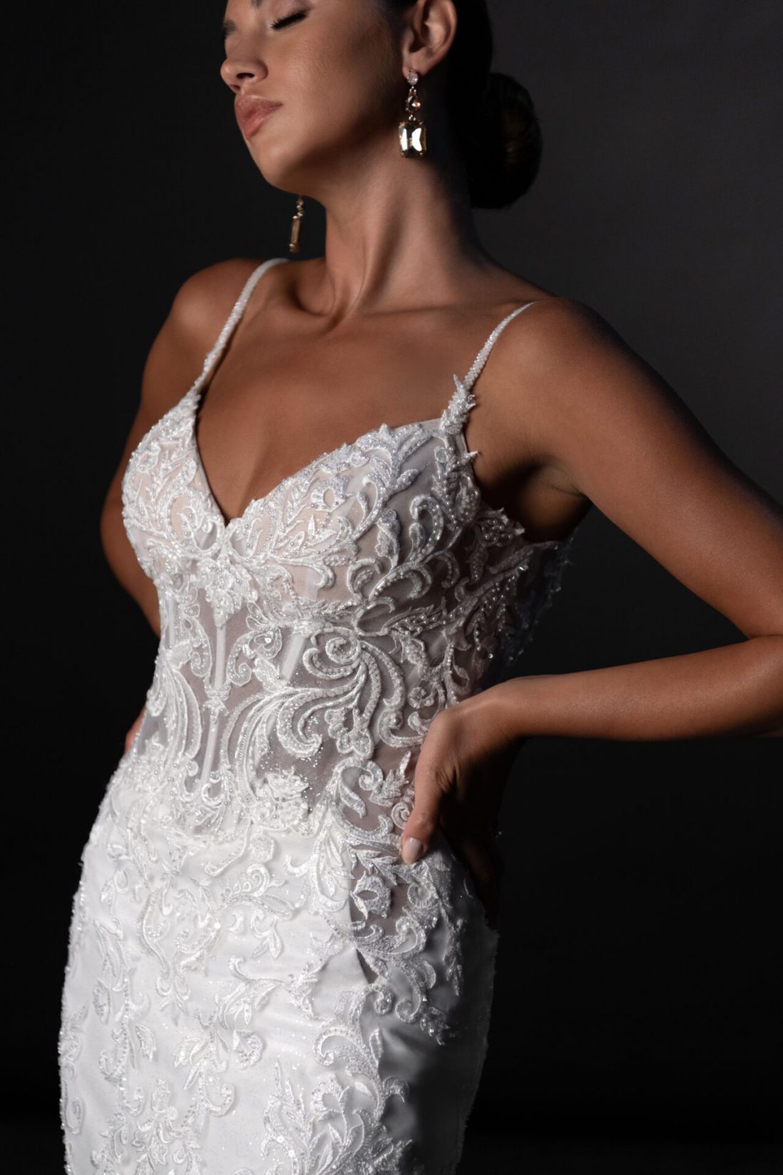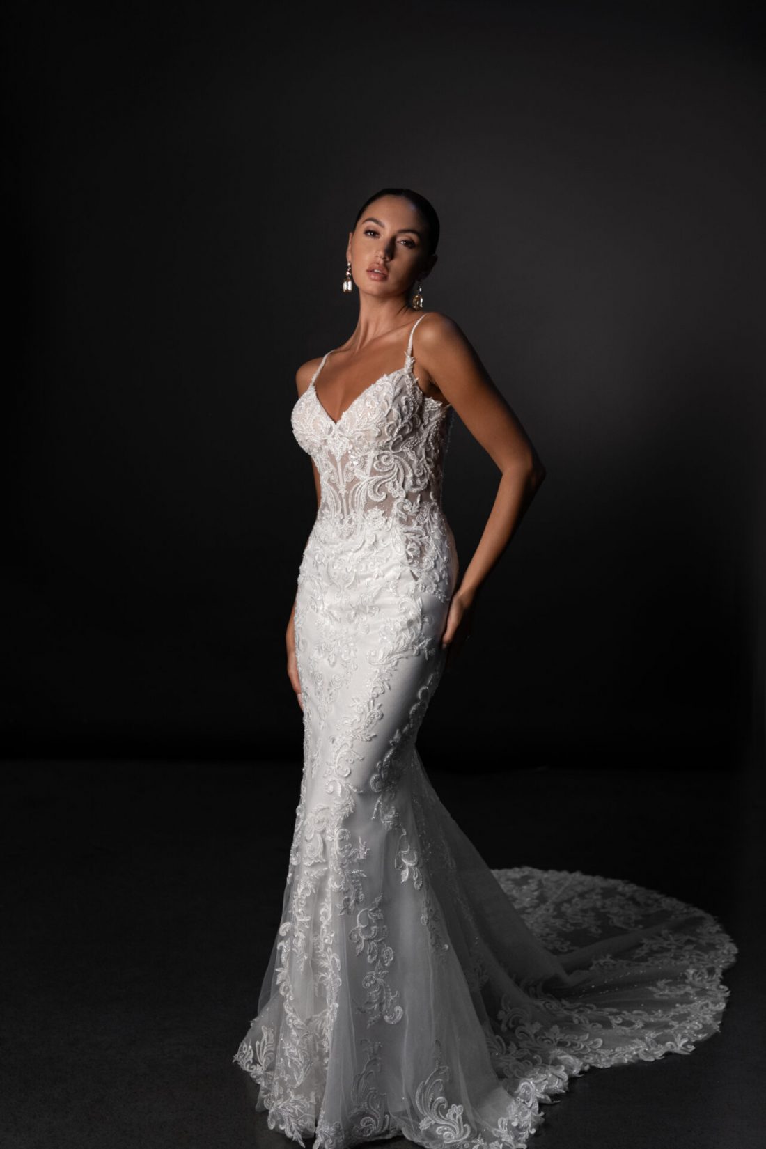 Soft and romantic meets daring sophistication, 1916 is a fashion-forward fit-and-flare wedding gown. Heavily embroidered scrolling lace appliqués dance across the luxurious sheer bodice with exposed boning. The structured bodice features a deep sweetheart neckline for a sultry yet timeless look, balanced by delicate straps and a daring low back. Adding an unexpected twist, illusion cutouts trail from the bodice to the upper hip for a modern, high-fashion edge.