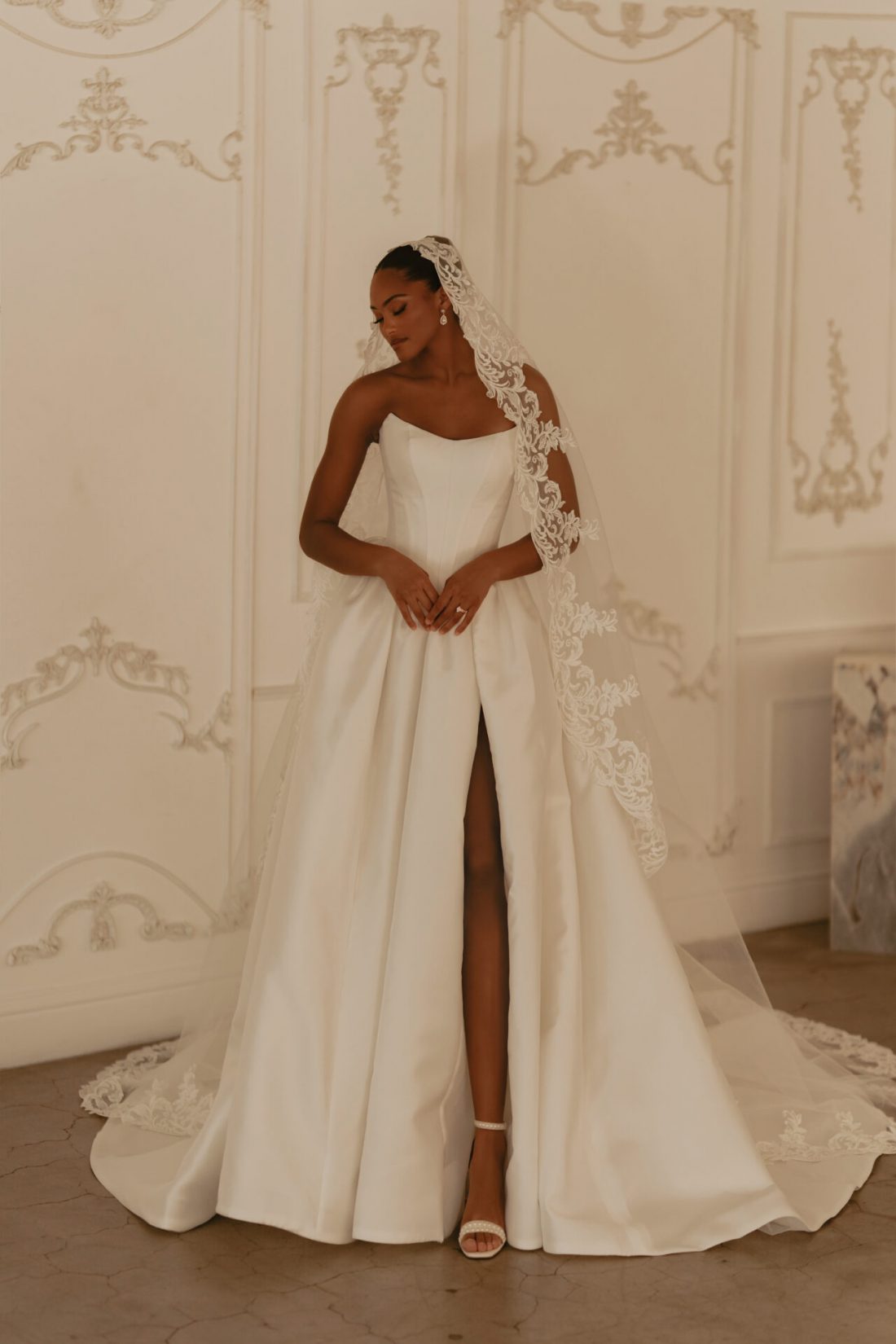 Sleek and undeniably chic, this gown transforms classic bridal elegance into a modern masterpiece. The cat-eye neckline adds a bold and fashion-forward twist to the strapless Basque waist bodice which then flows into a voluminous ballgown skirt, featuring a high-leg slit for an unexpected touch of contemporary glamour.