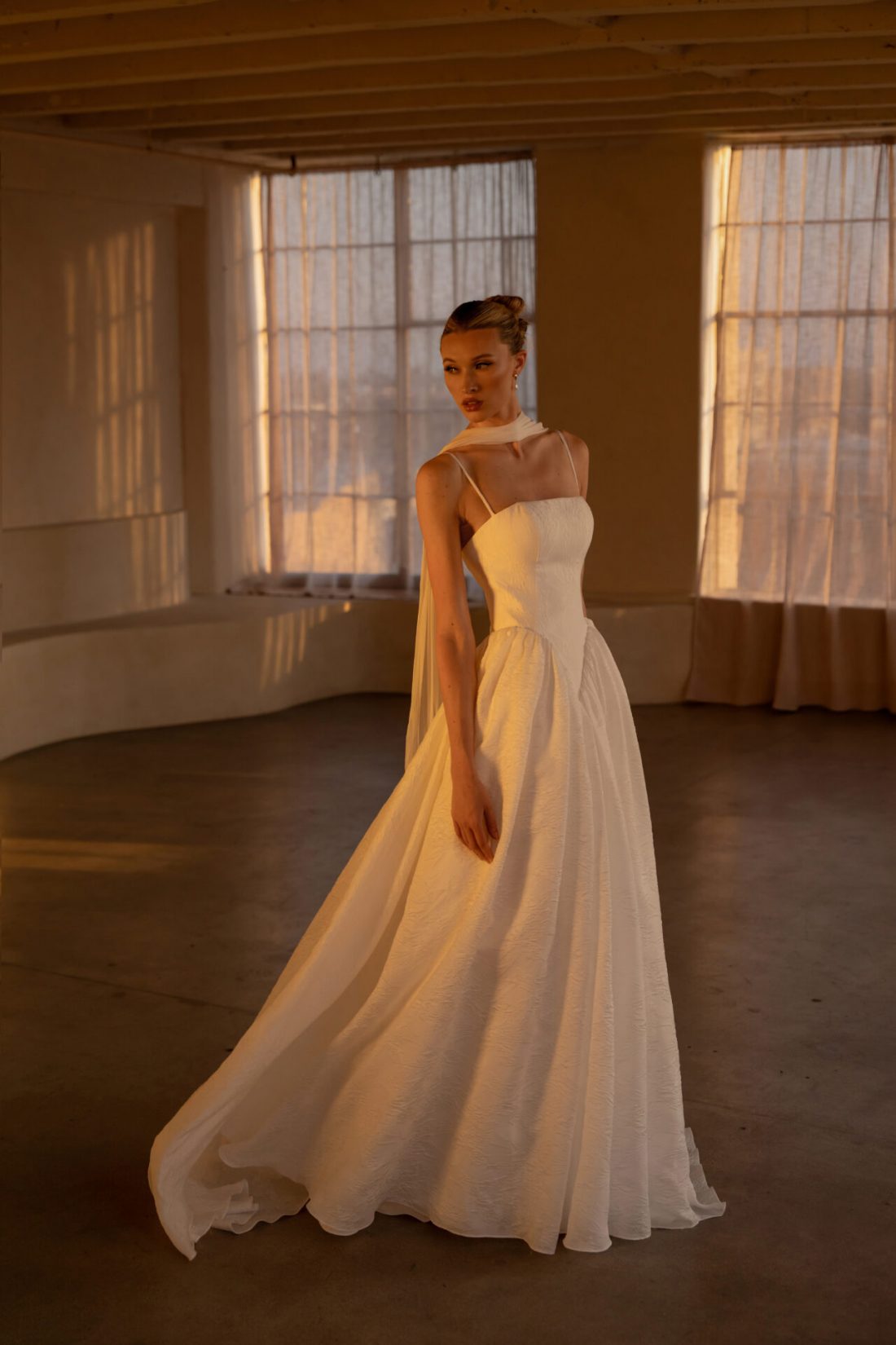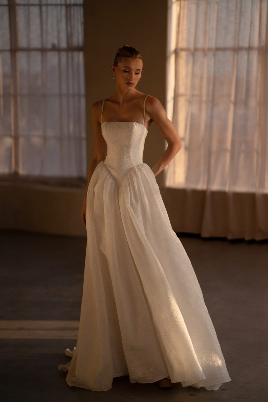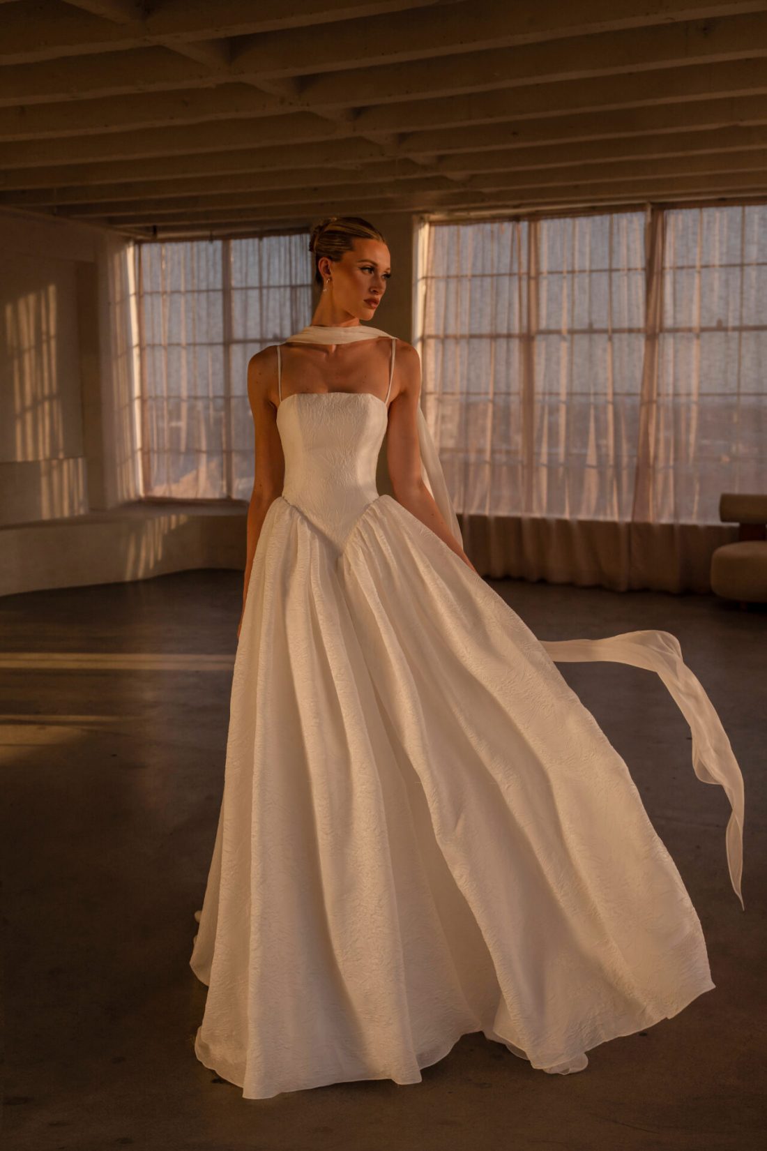 Timeless romance meets modern artistry, in this regal A-line gown crafted in rich Organdy Jacquard. The straight-across neckline is framed by delicate spaghetti straps, while the deep Basque waistline sculpts the bodice into a flattering elongated silhouette. Dramatic hip volume creates a striking couture effect before unfolding into a full A-line skirt, flowing into a sweeping train. This gown balances elegance and grandeur for the bride who dreams of making a statement in classic yet fashion-forward style.