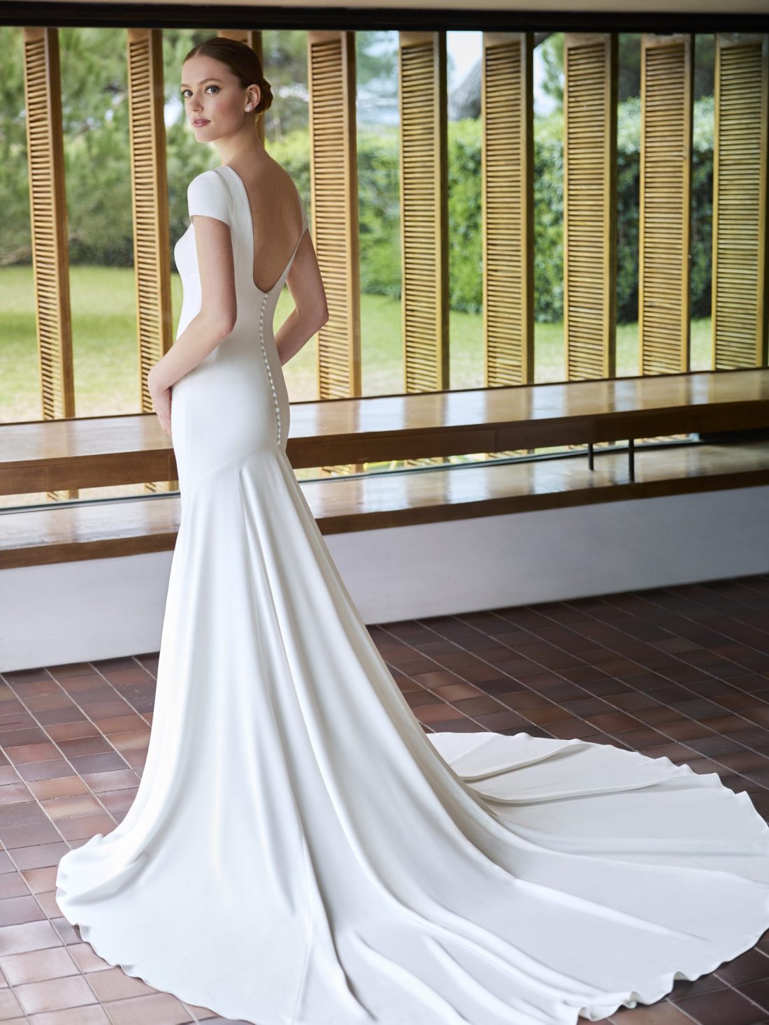 Agnies is a sophisticated mermaid dress with round neckline, short sleeves and scoop back which flows into a fabulous train. Beautifully elegant and timeless.