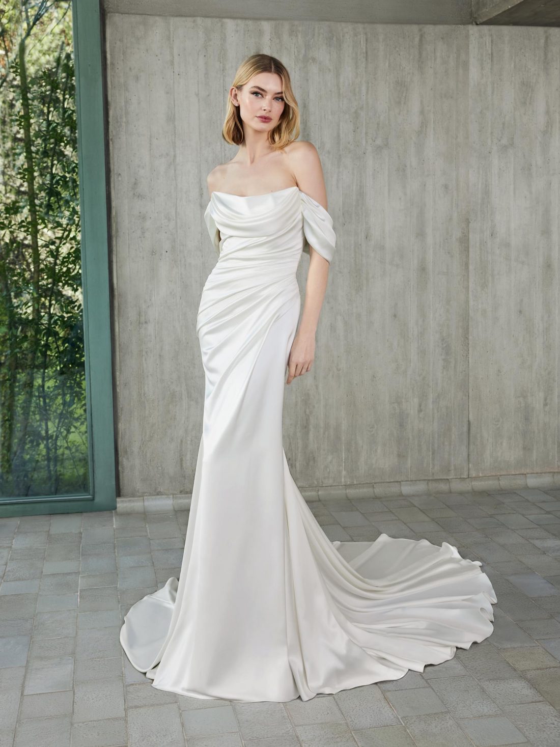 Viviama is the perfect harmony of timeless elegance and adaptable style. Crafted from luxurious satin with delicate gathers, she offers a graceful mermaid silhouette that flows effortlessly. This dress is the perfect choice for the modern bride seeking sophistication and charm. Available with beaded detachable sleeves for a truly versatile look.