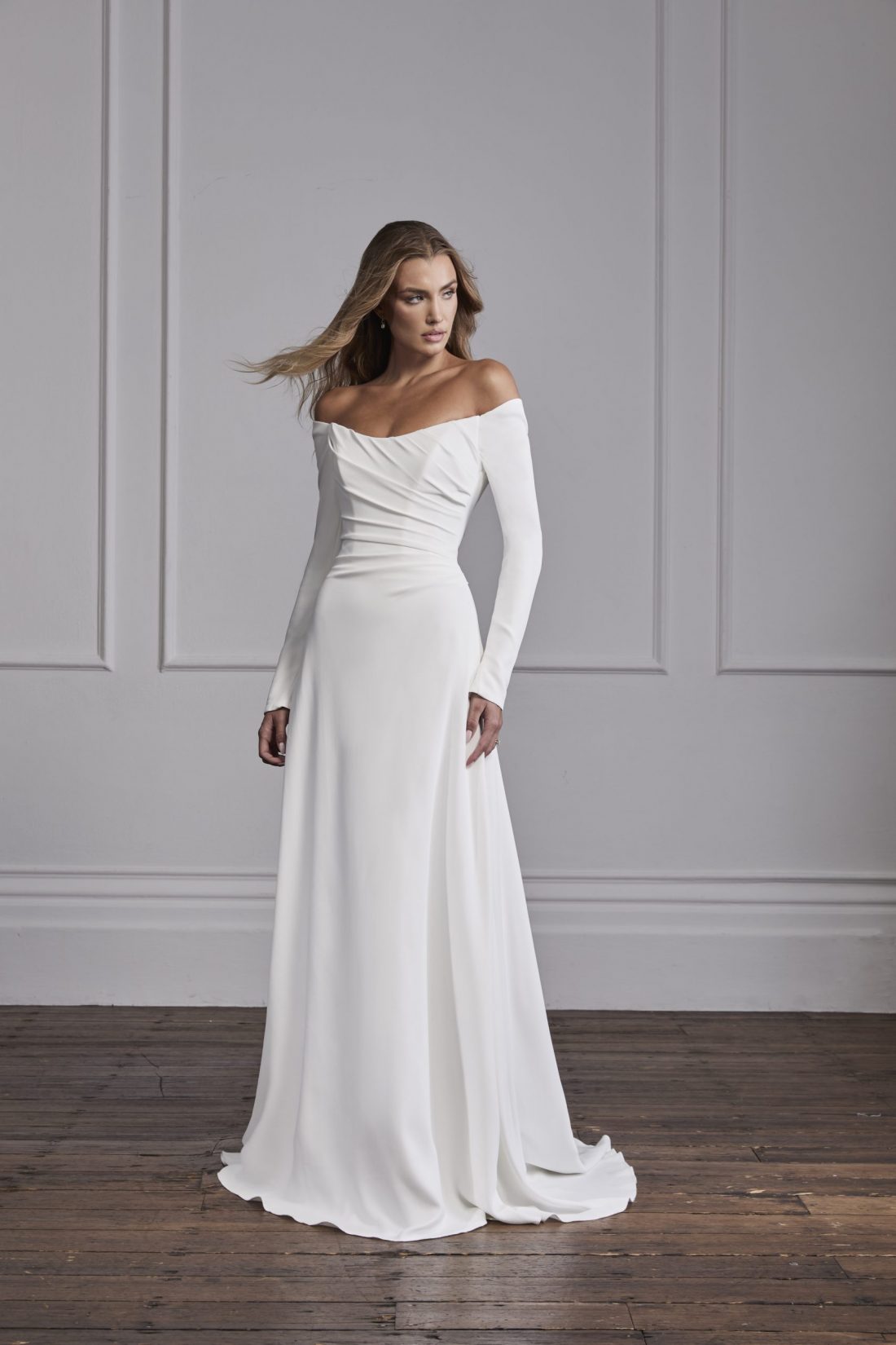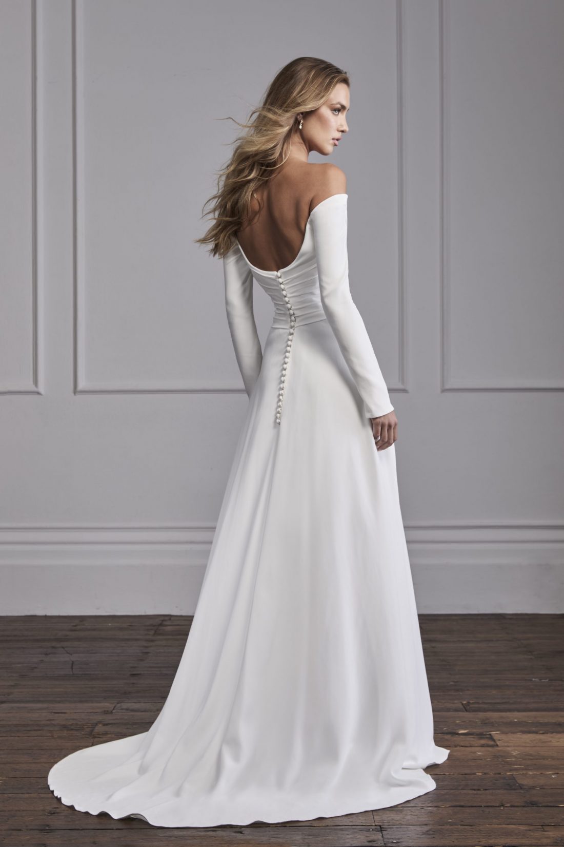 Margaux is the epitome of modern minimalism with a twist of timeless elegance. This A-line gown features a flattering bateau neckline at the front and back, full-length sleeves, and signature button-back detail for a couture finish. Designed in a soft structured fabric making this gown lightweight and effortless to wear. Perfect for the bride who loves simplicity, structure, and a touch of drama.