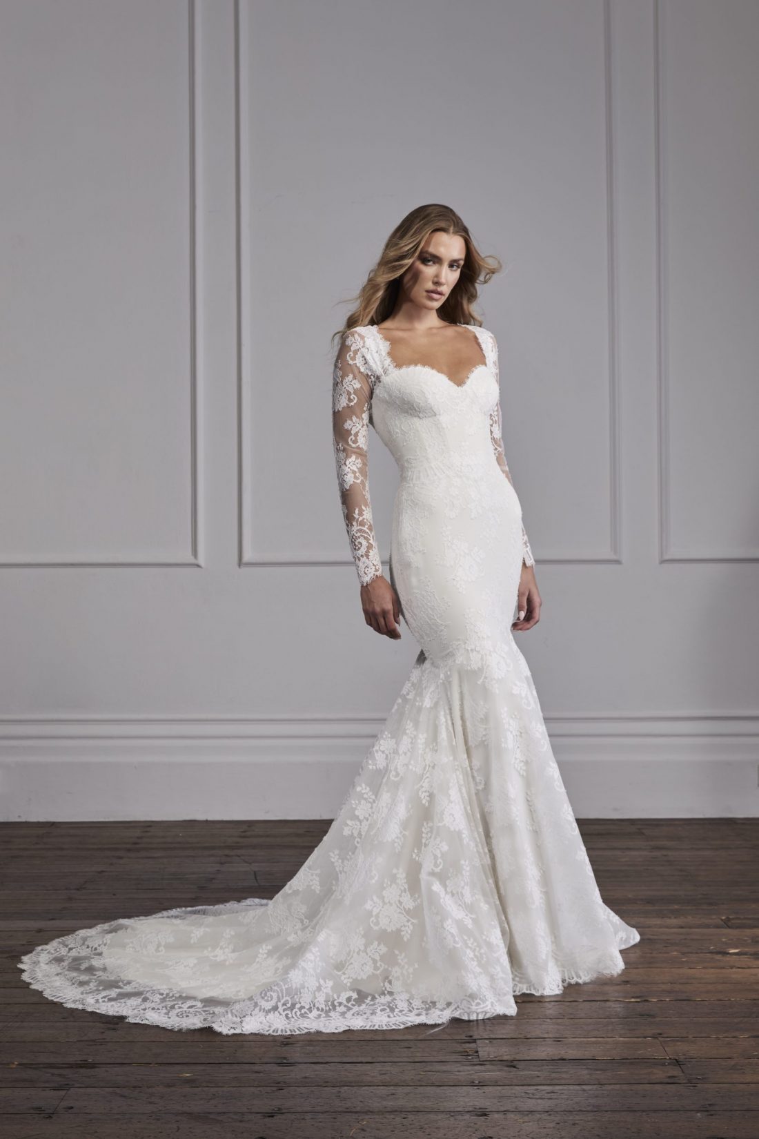 Solenne is elegant, charming and beautifully romantic featuring exquisite lace detailing. Designed with a sweetheart, cupped, corseted bodice, that offers structure and support along with a flattering fit. The fishtail silhouette gracefully contours the body, creating a refined and sophisticated bridal look perfect for making a lasting impression.